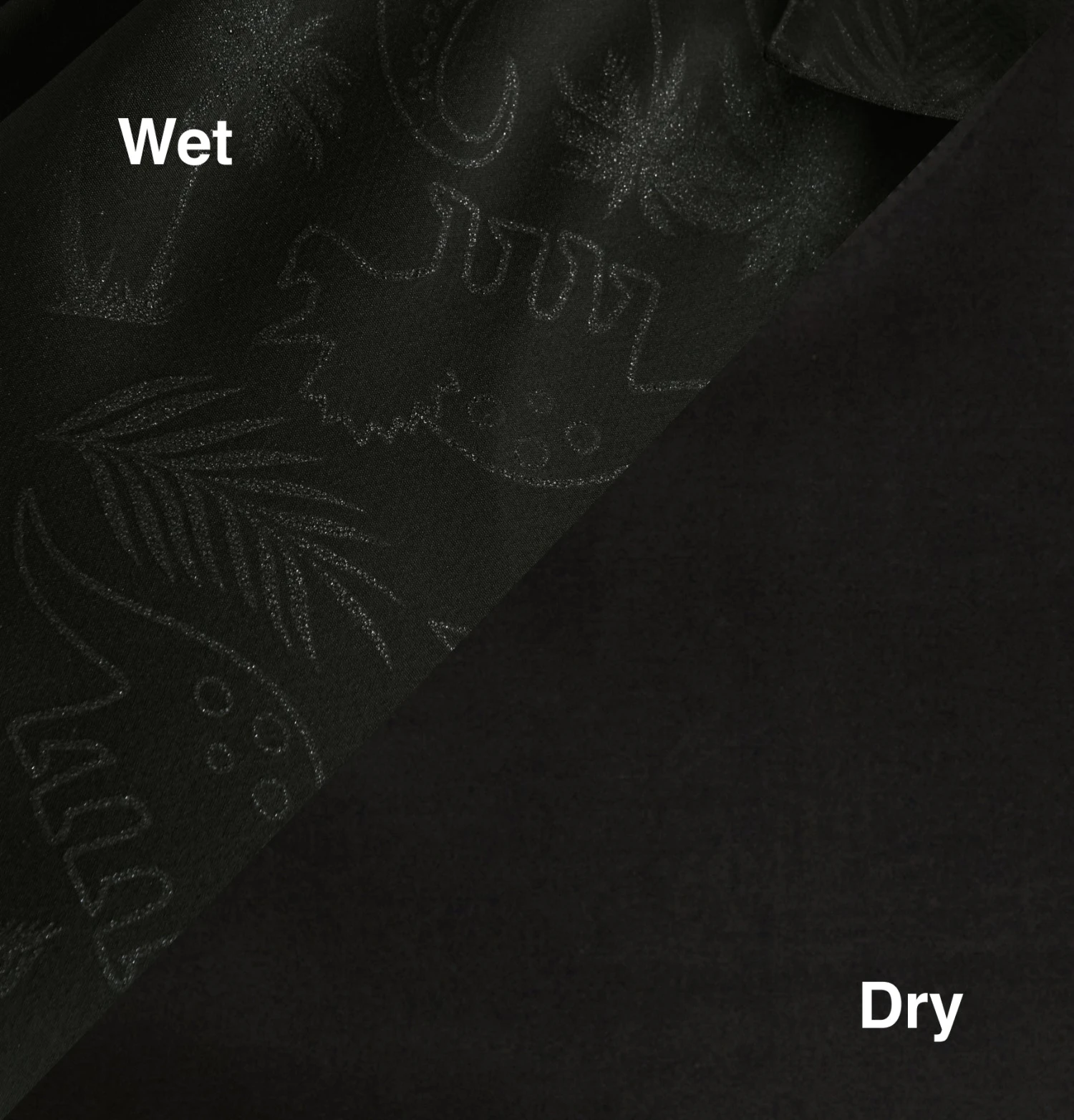 Our innovative color-changing technology responds to water contact. The moment moisture hits the fabric, the previously invisible dinosaur print transforms from black to vibrant color. Once dry, the fabric returns to its sleek, all-black appearance—ready to surprise again and again.