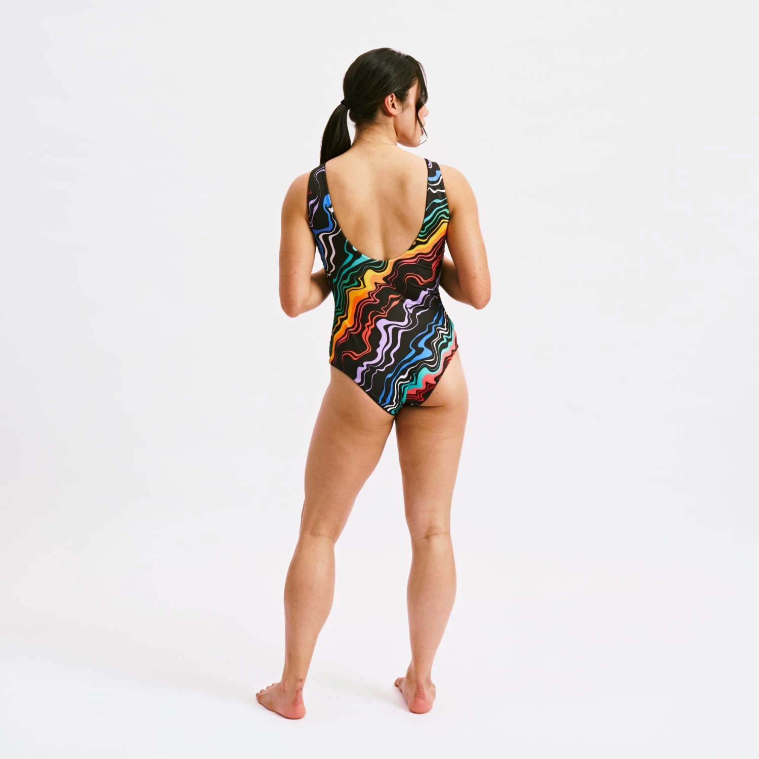Double the style, double the fun! The Swim Reversible One-Piece is your new go-to for effortless versatility. With a sleek black side for days when you want to keep it classic, and a pop of fun colors on the reverse for when you’re feeling bold, this one-piece is designed to adapt to your mood. Its scoop front and low back offer a flattering fit on either side. Whether you’re diving into the deep end or lounging poolside, this reversible suit provides the ultimate combination of comfort, style, and sustainability.